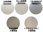 【2B】…(SUS304材)未研磨のステンレス板で、汎用材として建築一般内装材・厨房等に幅広く使用されております。 【No.1】…(SUS304材)2Bと同じく未研磨のステンレス板。銀白色で光沢が無い表面で、表面光沢を必要としない用途に。 【#400片面研磨】…(SUS304材)2B材を400番バフによって片面研磨仕上げしたステンレス板。厨房器具などに多く使われています。 【ヘアライン(HL)片面研磨】…(SUS304材)表面を150-240番の研磨ベルトでヘアーライン(毛)模様に研磨した物で、建材の最も一般的な仕上げになります。 【2B-SUS430】…(SUS430材)磁性があり磁石が付きます。SUS304より耐食性・強度は劣りますが安価で経済的(屋外使用はサビが発生しやすいため不向きです) |