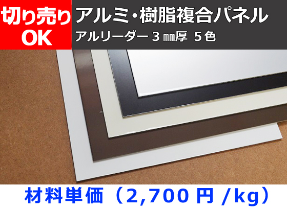 アルリーダー(アルミ樹脂複合パネル)(3.0㎜厚)各カラー(5色)板の希望寸法での切り売りです。 アルミニウム+ポリエチレン樹脂+アルミニウムのサンドイッチ構造で錆びないことや、釘・木ネジが使用できる特徴があります。 アルミ単板と比較して、芯材に発泡樹脂を使用することでの超軽量性、サンドイッチ構造による平滑性、高剛性、吸音性が挙げられます。 軽くて(重量はアルミの1/3)女性にも扱い楽々 錆びる事なく綺麗です。各種DIY工作等や多種・多用途にご利用ください。 |