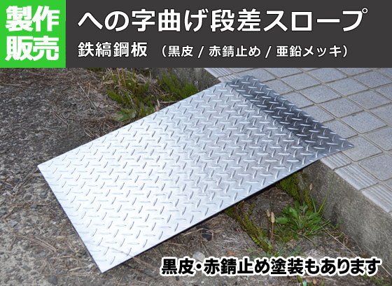 鉄製 縞(シマ)鋼板のへの字曲げスロープ製作品。段差スロープを自由な寸法でオーダーメイド! 表面仕上げを黒皮・赤錆止め塗装・亜鉛メッキから選択可能。 横(幅W)、縦(かかりK+斜長S)を自由に指定・選択できます。 受注製作品のため、製作に4~7日かかる場合があります。 |