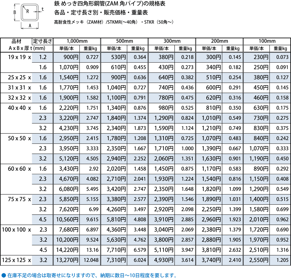 高耐気候性メッキ(ZAM)四角パイプの各品形状を(1000~100mm)定寸長さでの希望(品形状・定寸法・本数)の販売です。 高耐気候性、耐食性に優れたZAMメッキで、耐食性は溶融亜鉛めっきに比べ10~20倍優れています。錆びにくいため塩害にも強く、海岸地域でも安心して使用ができます。建築土木材や自動車関連部材等にも幅広く用いられています。 溶接管のため継ぎ目・内部に溶接バリがあります。 |